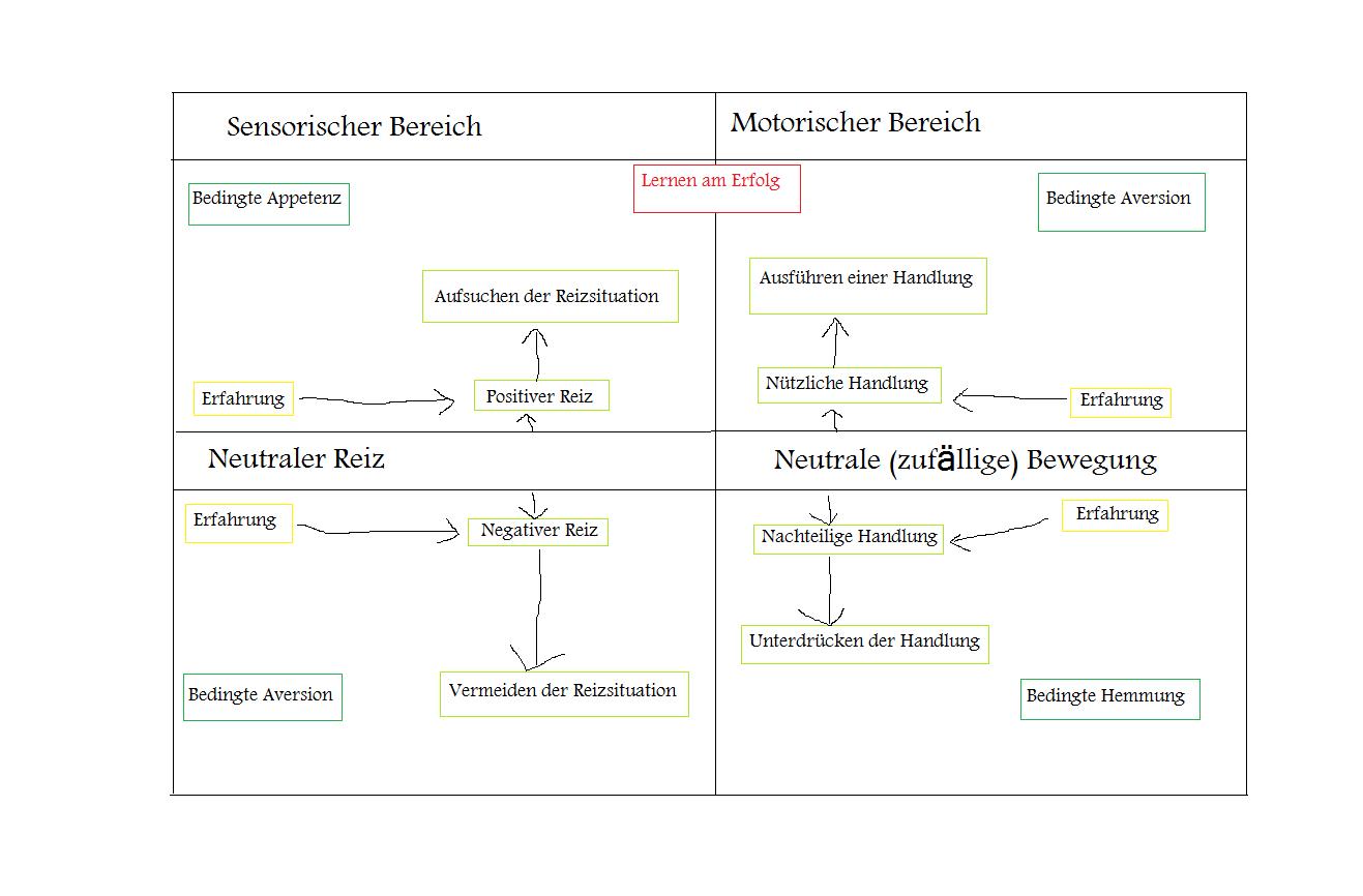 Nicht ganz. In der Grafik geht es eigentlich um die Positive und die Negative Belohnung. Dass heisst soviel wie, wenn du z.B. etwas tust was du nicht solltest, und man dir dann jedesmal einen Stromschlag versetzen würde, dann würdest du das nächste mal versuchen diese Situation( also diese Handlung) zu vermeiden. Also das Pferd würde in dem Fall versuchen, die Situation zu vermeiden. Aber ohne Zusammenhang,sagt die Grafik eigentlich nicht viel aus.. @ Jassi Es ist nicht in dem Sinne schlimm für den Hund, aber sehr verwirrend. Besonders für Tiere die noch nicht wirklich mit dem System vertraut sind. Wir haben das so gemacht: Unsere Testperson wurde vor die Tür gestellt, und wir im Schulzimmer haben eine Aufgabe festgelegt, was wir dem "Hund" beibringen wollen. Die aufgabe war, dass er die Leber, die auf der Fensterbank lag, zur Lehrerin bringt. Für jeden Klick gab es für ihn ein M&M. Erst mal hat er für jeden Schritt zur Fensterbank einen Klick bekommen. Als er dann auf einmal fürs auf die Fensterbank zu gehen keinen Klick mehr bekam, war er schon zum ersten mal verwirrt, und begann mit einer anderen Handlung. Dann kam er per zufall mal nah an die Fensterbank heran, bekam einen Klick, und war wieder erstaunt, wieso er jetzt plötzlich wieder einen Klick bekam. Er dachte es habe mit der Handlung , die er vorher durchgeführt hatte( er hatte eine Hand in der Hosentasche und lief gerade um einen Tisch herum), zu tun. Also begann er immer im Kreis um den Tisch zu laufen und eine Hand in die Tasche zu stecken. Dafür bekam er zwar keinen Klick, aber weil er jedesmal näher an die Fensterbank ging, bekam er dann eben doch einen. So ging es weiter, er wurde immer verwirrter, fragte uns sogar ob wir ihn verarschen, weil wir natürlich alle lachen mussten, wenn er so um die Tische lief. Schlussendlich hat er es nicht geschafft, und wir hatten ihn von seinem "Hundedasein" befreit