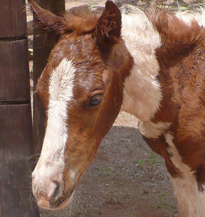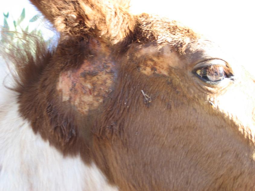 Das Fohlen hat an manchen Stellen im Fell keine Haare mehr, nur noch die nackte Haut quasi. Darauf teilweise Schorf, der sich ablöst. An manchen (wenigen) Stellen ist es blutig. Für mich sieht es aus wie ein Pilz o.ä.