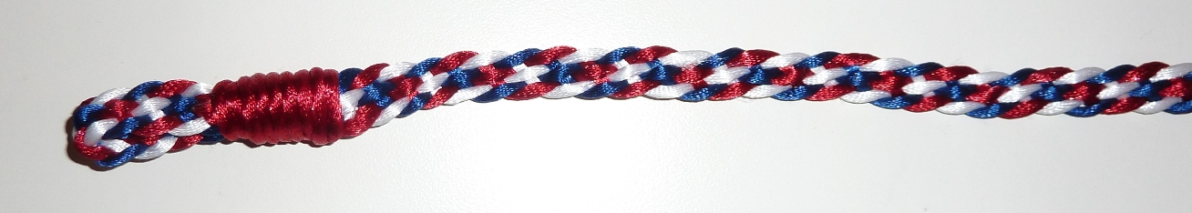 Ja das ist mit 4 Bändern rund (nicht so platt) geflochten, nachdem ich den Bogen raushatte ging es auch relativ schnell. Der Karabiner ist mit einer Schlaufe befestigt, also austauschbar. Das Ende ist erstmal nur mit einem Gummiband verschlossen. Das soll laut Buch mit Takelgarn umwickelt und vernäht werden. Leider habe ich noch kein Takelgarn. Deshalb überlege ich erstmal noch wie ich das machen kann. Eigentlich sähe ein schöner dicker Knoten auch gut aus...mal schaun! Bin gerade voll im Bastelfieber, habe aber leider kein Band mehr