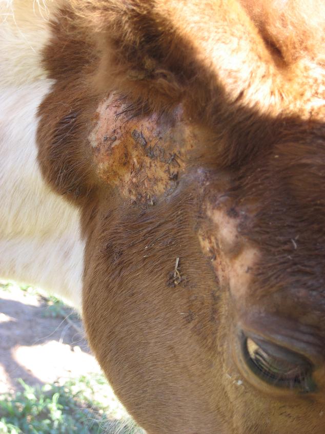 Das Fohlen hat an manchen Stellen im Fell keine Haare mehr, nur noch die nackte Haut quasi. Darauf teilweise Schorf, der sich ablöst. An manchen (wenigen) Stellen ist es blutig. Für mich sieht es aus wie ein Pilz o.ä.
