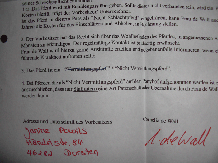 Ebenfalls ist bei Frau de wall auf dem vertag auf einmel nichts mehr durchgestrichen wenn es doch vermittlungspferde seien sollen sollte das NICHT vermittlungspferde gestrichen sein ist es nicht ich finde es eine frechheit und eine beleidigung !