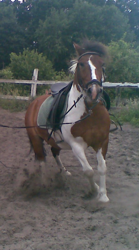 Zu ihm: Er ist 1,38m groß, Gewichtsträger, sehr lustig. Er hat viele Flausen im Kopf (kann beispielsweise nicht alleine am Anbinder stehen, weil er sonst 2 Minuten später "mal eben Fressen geht"), er tritt und beißt nicht, ist nicht bösartig, kann lieb im Umgang sein (d.h. er ist immer lieb, aber man muss sich durchsetzen können), er probiert bei jeder neuen Person erstmal ordentlich aus, wie weit er gehen kann. Läuft auf dem Platz gut, in der Halle ebenso und ihm Gelände macht er aus Freude manchmal einen kleinen Buckler (merkt man auf ihm aber nicht).